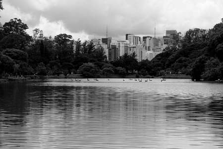 Landscape showing a lake where swans swim, green grass and the city in the background. Sao Paulo; Brazil.