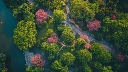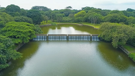 A breathtaking aerial view showcases a serene water body surrounded by dense greenery, offering a perfect escape into nature's tranquility and beauty.