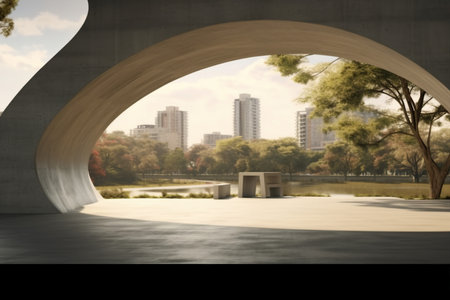 Space for products showcases in the concrete hallway with a park background.3d rendering. generative AI.