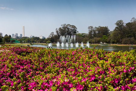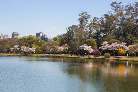 Sao Paulo, Brazil.18 September 2016. Ibirapuera Park in Sao Paulo, with the first flowers of early spring. In the background, the Obelisk of Sao Paulo.
