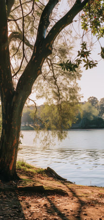 Black swan coral tree lake in Ibirapuera Park, Sao Paulo, Brazil Selective focus on tree