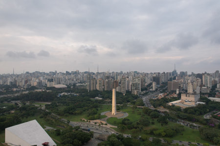 Aerial view of Sao Paulo city and obelisk monument, next to Ibirapuera Park. Prevervetion area with trees and green area of Ibirapuera park in Sao Paulo city, Brazil.