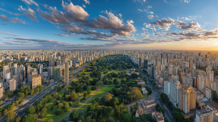 Aerial view of Sao Paulo, Brazil, showcasing a vast urban landscape with numerous high-rise buildings surrounding a large green park under a partly cloudy sky during sunset.