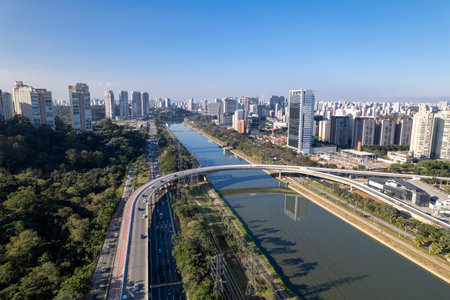 City of Sao Paulo, Brazil. South America. Marginal Pinheiros Avenue, and Pinheiros River.