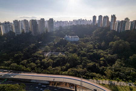 Sao Paulo, Brazil. September 11, 20116. Aerial view of Ibirapuera Park in Sao Paulo, and neighborhoods. In the foreground Avenue May 23 and its pedestrian walkways.
