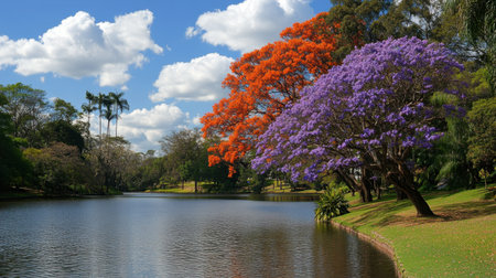 A stunning scene featuring vibrant orange and purple trees by a peaceful lake under a blue sky. Perfect for nature lovers and outdoor enthusiasts.