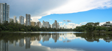 Lake reflecting on the water the city and the blue sky. Margins of the lake Igapo in Londrina, PR, Brazil.