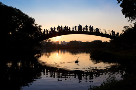 Sao Paulo, Brasil. Mars 18, 2018. Tourists watching the sunset from the bridge of Ibirapuera Park, Sao Paulo.