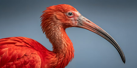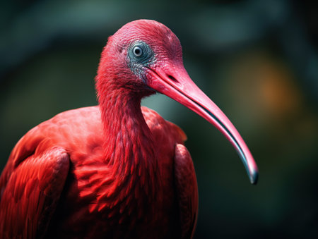 Detailed head shot of a vivid scarlet ibis bird its bright red feathers contrast with pale head and long curved black beak bird is looking to side showing its sharp eye wildlife portraiture