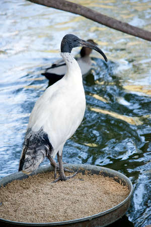 the white ibis is standing in a feeding dish