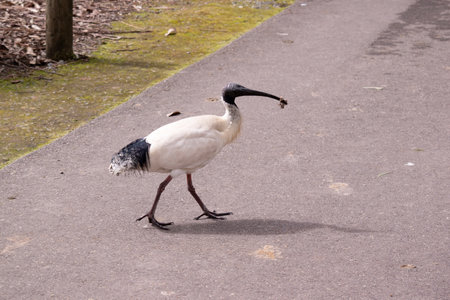 the white ibis is walking on a pathway