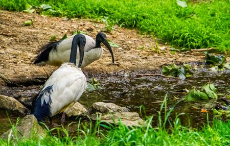 two african sacred ibises together at the water side, tropical wading bird specie from Africa