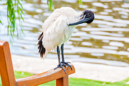 Sacred ibis bird grooming itself sitting on the bench near the pond in urban park