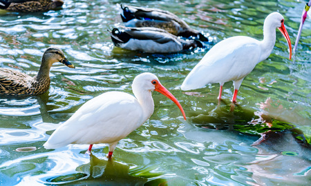 American White ibis Eudocimus albus birds scavenge for food at a park in Naples, Florida, USA