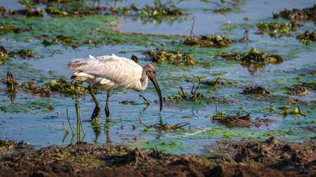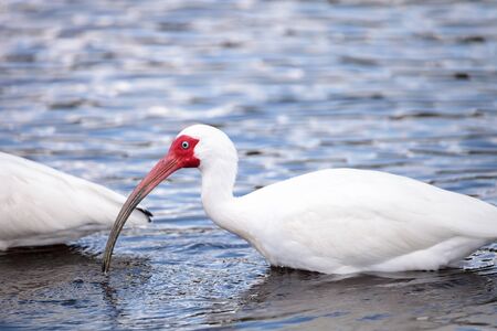 White ibis bird Eudocimus albus wades through a marsh and forages for food in the Myakka River in Sarasota, Florida.