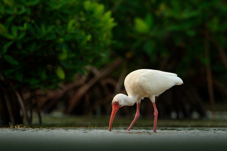 Feeding scene with bird. White Ibis, Eudocimus albus, white bird with red bill in the water, feeding food in the lake, Mexico. Wildlife scene from nature. Mangrove trees with white bird with red bill.