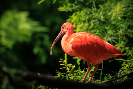 Scarlet Ibis bird Eudocimus ruber tropical wader bird foraging on the ground. It is one of the two national birds of Trinidad and Tobago.