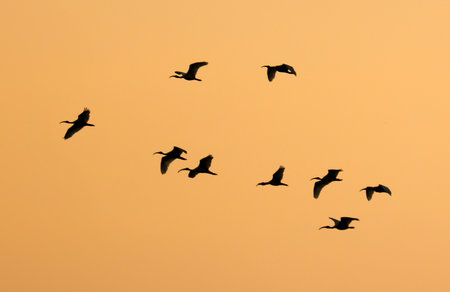 A flock of birds flying in the sky. The birds are flying in a line and are silhouetted against the orange sky