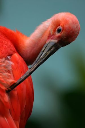 Scarlet ibis cleans feathers