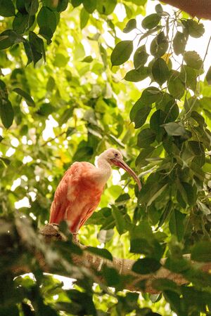 Young Scarlet Ibis, Eudocimus ruber stands on a tree branch
