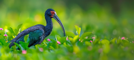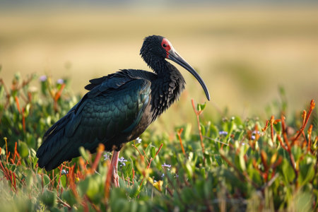 Elegant scarlet faced ibis in the golden hour splendor of serene marshland habitat