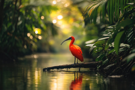 Vibrant scarlet ibis perched on a branch above a tranquil river, surrounded by lush rainforest vegetation