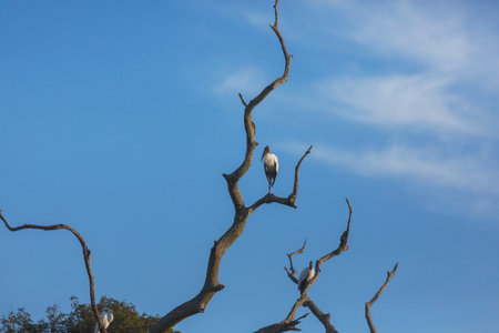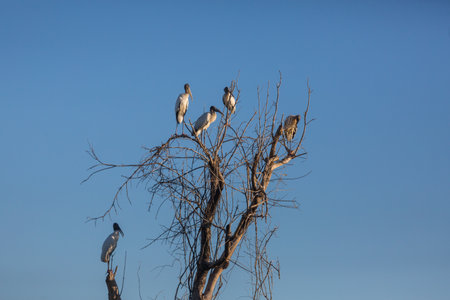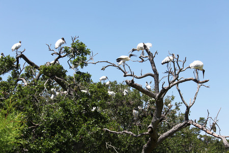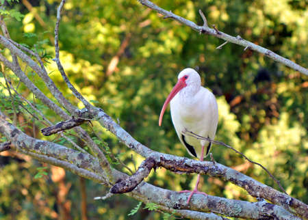American white bird Eudocimus albus wading bird perched on a tree in swamp of Myakka River State Park in Sarasota