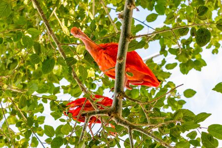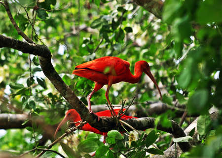 Two birds Scarlet ibis are admired by the reddish coloration of feathers