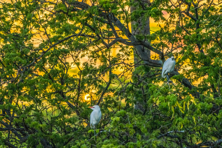 Colorful White Cattle Egrets Herons Bubulcus Ibis Nesting Colony Tree Sunset Ala Wai Canal Waikiki Honolulu Hawaii. Egrets introduced into Hawaii in 1959.