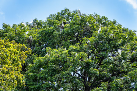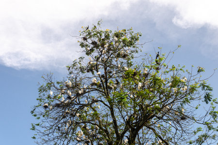 large group of cattle egrets with nests in a tree, birds nesting in a tree, bird breeding season in spring