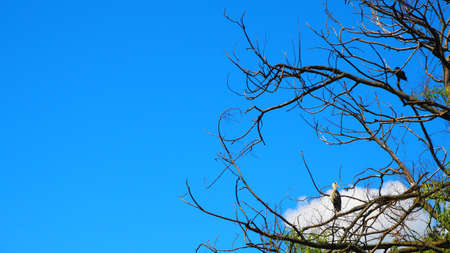 A scenic view of Frigatebirds perched on tree branches on a cloudy sky background