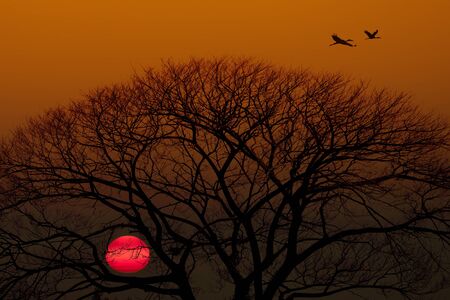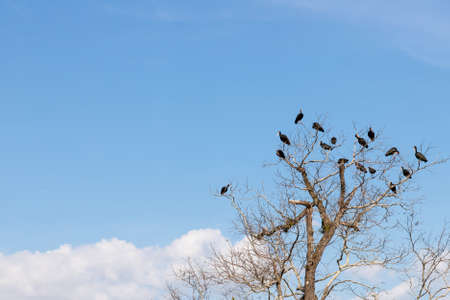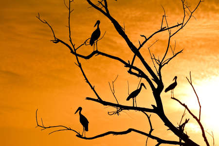 Silhouette of many asian open billed stork birds on a treetop with Colorful background