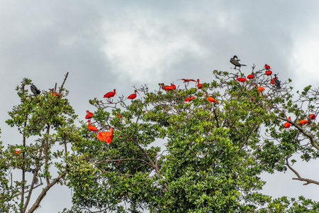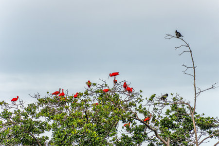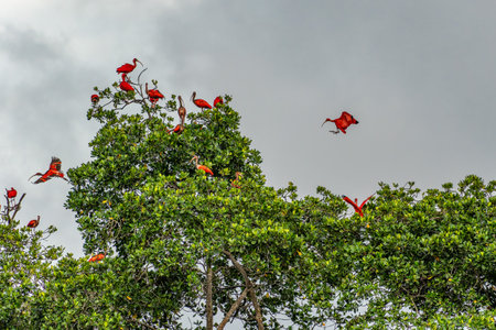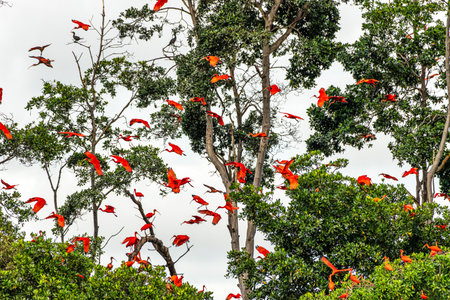 Large red scarlet ibis flying back home to their sleeping place, Revoada dos guaras, which means the flight of the guaras, a phenomenon that occurs daily on the Delta of the Parnaiba River in Brazil