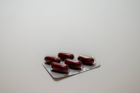 red capsules closeup on a white background. Medical background. Macro. tablets in the package and separately lying