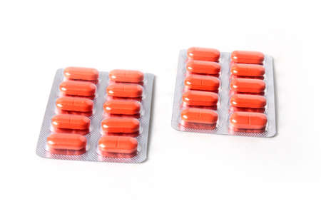 blister with red pills isolted on a white background. Medicine concept
