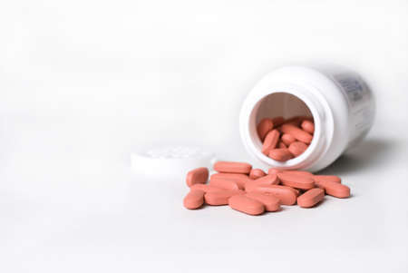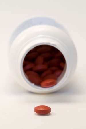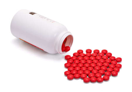 spilled pile of red tablets beside medicine bottle isolated on white