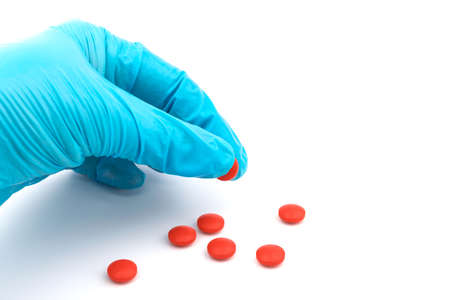 Gloved hands with red pills, The hand of the medical worker in medical gloves holding pills