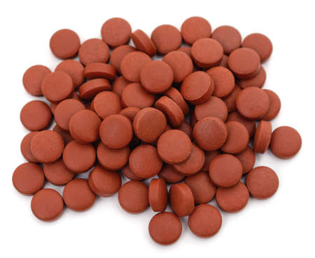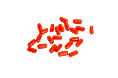 red sugar coated pills tablets vitamin on white background