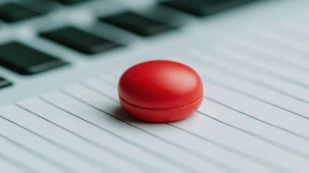A bright red round object rests on white lined paper, contrasting with a black keyboard in the background. Ideal for modern design concepts.