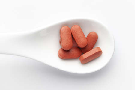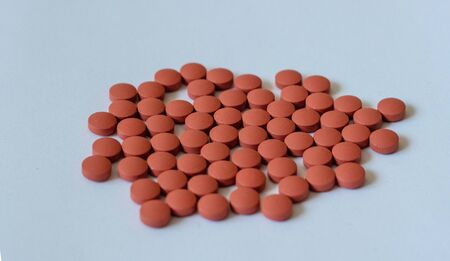 Medicine pills, vitamins and food supplements of red color on white background.