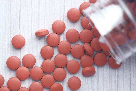 Pills of the medicine lie on a red table in close-up