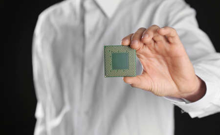 A man holding a microchip showcasing innovation in digital technology and electronics. Concept Digital Technology, Innovation, Electronics, Microchip, Man