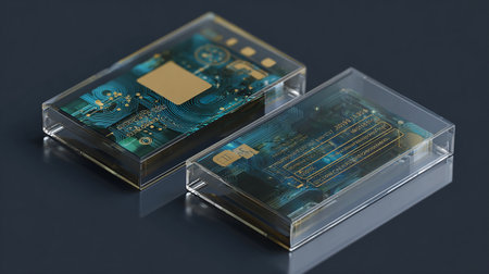 An overhead view displays a detailed circuit board with a central microchip highlighted in focus. The design incorporates small electronic components in various shapes and sizes. The color scheme features blacks, grays, and green. This image is suitable for technological and design-related projects and can be used in diverse media.