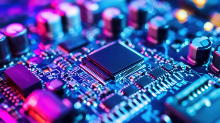 This close-up image captures a detailed circuit board featuring intricate components illuminated by vibrant colors, representing modern electronic technology.