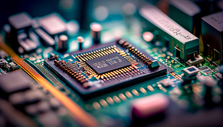 Close up of an electrical circuit board with a CPU, a microchip, and other electronic components in the background. Generative AI