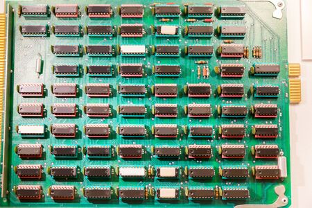 Close up of electronic circuit board with microchips. Technology background