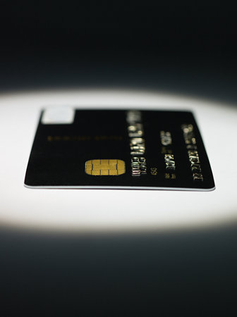 Plastic credit card with chip visible, on top of a table with soft lights and shadows. Colored card on white surface. Concept: finance, purchases, payments, loans, spending, investments and debts.