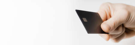 Ukraine, Odessa - April 04, 2020: a man holds out a bank card for payment. Contactless Bank Card Monobank. View from above. Selective focus. Close-up