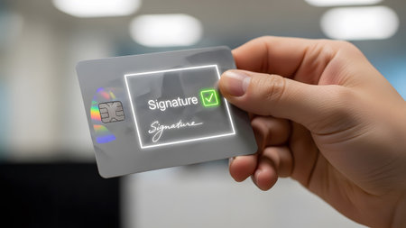 Stock showing hand holding silver credit card with digital signature and green checkmark.