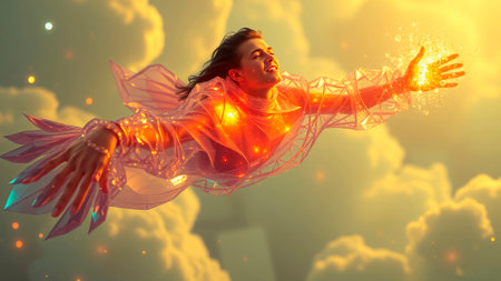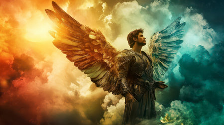 A figure with large, colorful wings poses dramatically against a backdrop of swirling clouds in hues of orange and teal.